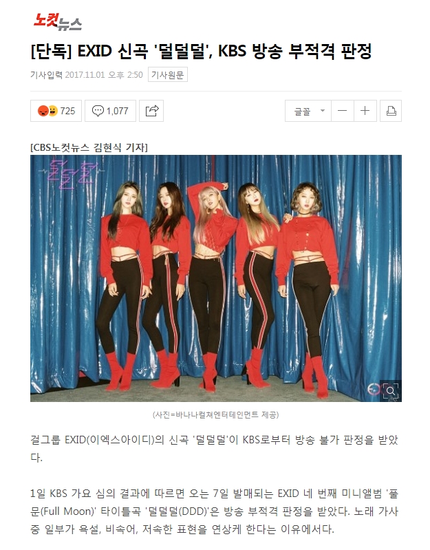 1/11 quả là một ngày đầy biến động với các fan của EXID dù chỉ còn vài ngày nữa nhóm sẽ chính thức comeback. Sau thông tin Solji không thể tham gia quảng bá, KBS vừa đưa ra “lệnh cấm” dành cho ca khúc chủ đề Dul Dul Dul. Việc KBS tung blacklist hàng tháng đã trở thành điều quá quen thuộc nhưng Kpop fan vẫn không khỏi “ngã ngửa” trước lý do khiến EXID “bị hại”: Dul Dul Dul có phần lyric “Why don't you shh ma boy” và từ “shh” (với ý nghĩa “im lặng”) có phát âm giống “shit” - từ chửi thề trong tiếng Anh!