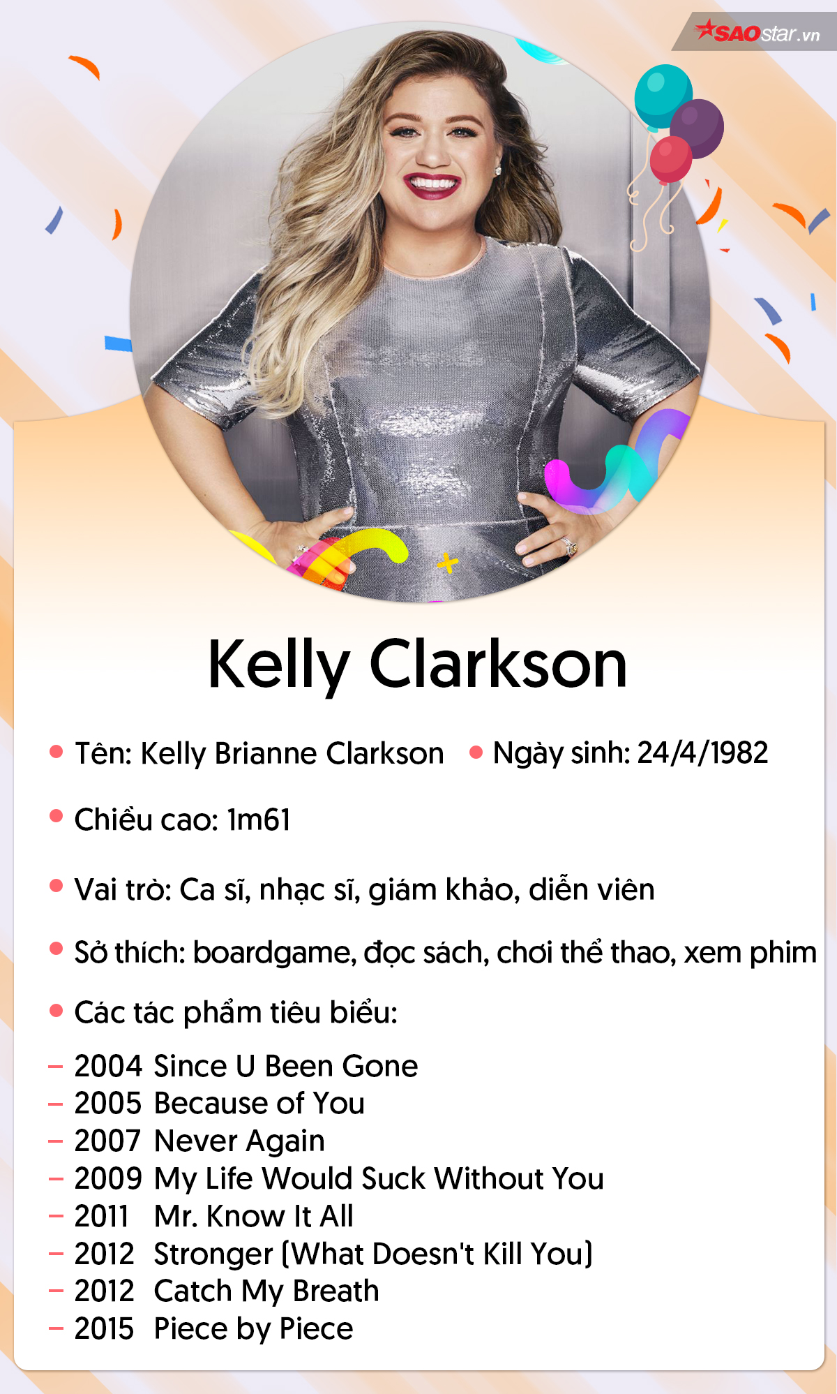 Hôm nay, Kelly Clarkson chính thức thổi bánh mừng sinh nhật lần thứ 36 với nhiều niềm hạnh phúc và viên mãn. Xuất phát từ cuộc thi tìm kiếm tài năng âm nhạc nước Mỹ American Idol, tên tuổi của cô đã được định hình trong lòng người hâm mộ toàn thế giới là một giọng ca đầy nội lực và nhiều cảm xúc.