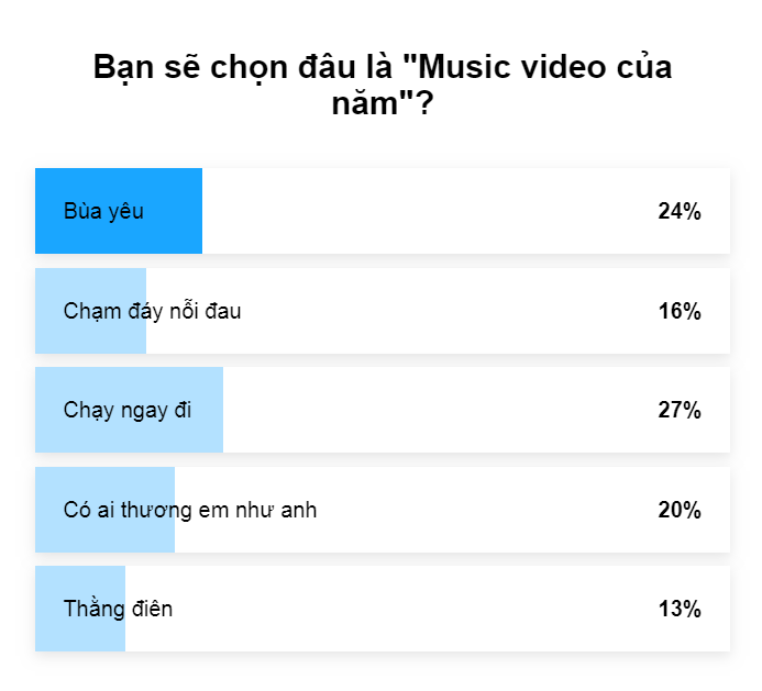 Ở hạng mục Music video của năm, Chạy ngay đi của Sơn Tùng M-TP đã xuất sắc giành vị trí quán quân sau một cuộc “rượt đuổi” hồi hộp với hai đối thủ bám sát ngay sau: Bùa yêu của Bích Phương (24%) và Có ai thương em như anh của Tóc Tiên (20%). Điều đó có thể thấy, sức ảnh hưởng của Sơn Tùng là lớn đến mức nào.