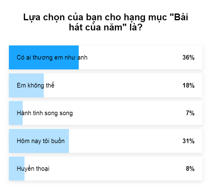 Với 36% tổng số lượt bình chọn, Có ai thương em như anh chính là ca khúc được người hâm mộ “đồng lòng” bầu chọn cho vị trí Bài hát của năm. Có ai thương em như anh tiếp tục là một sản phẩm “chắp bút” bởi Bùi Công Nam, đánh dấu sự kết hợp giữa Tóc Tiên và “người tri kỉ” Hoàng Touliver. Với 3 cái tên đình đám cùng hội tụ trong một bài hát, không
