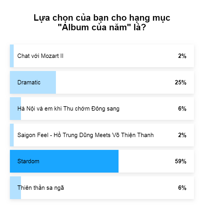 Ở hạng mục Album của năm, Stardom giành chiến thắng hoàn toàn cách biệt với các đối thủ còn lại khi có đến 59% tổng số lượt bình chọn. Đây là một sự ghi nhận của khán giả với những nỗ lực và cống hiến không mệt mỏi mà Vũ Cát Tường đã làm trong năm vừa qua.