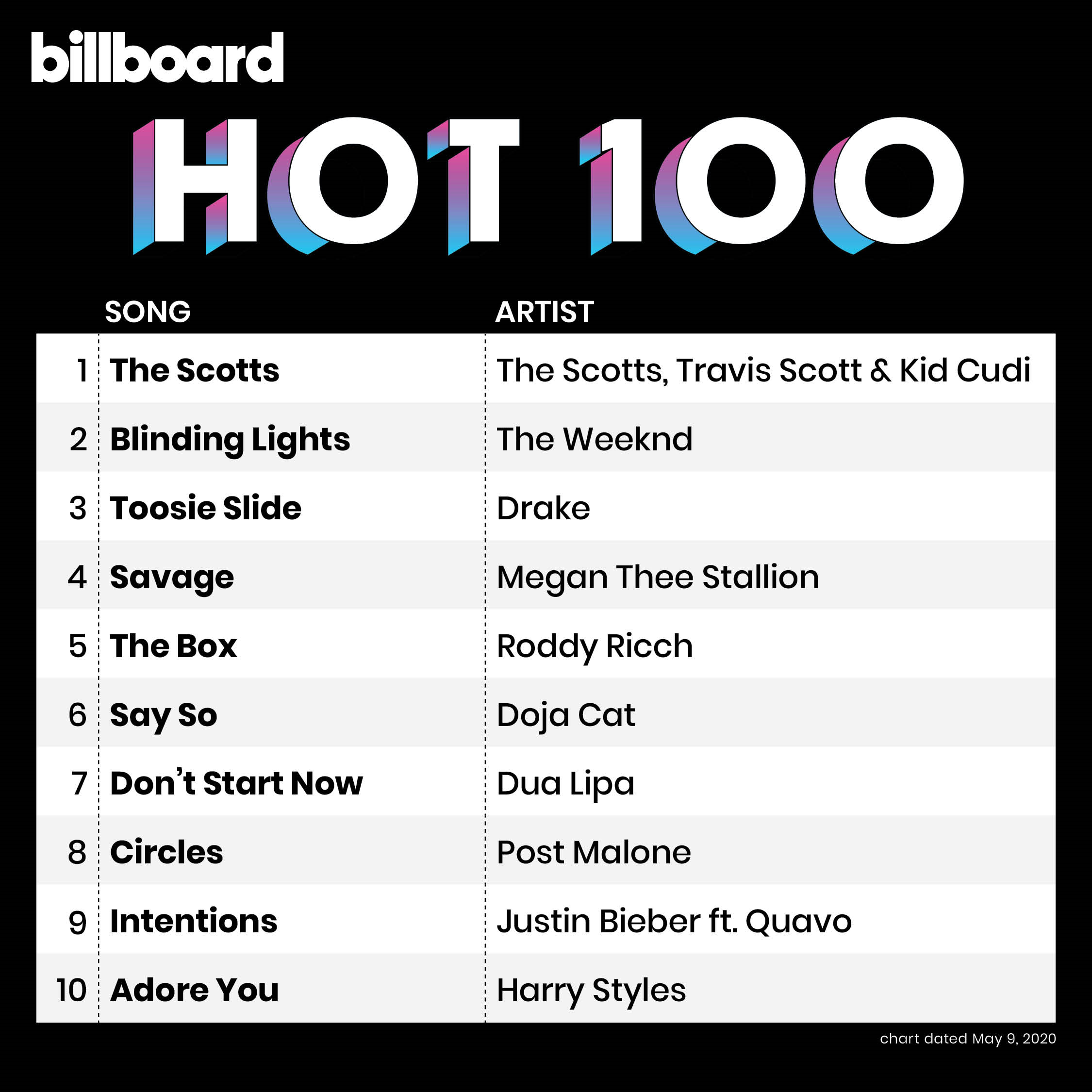 Sau 4 tuần lễ “thống trị” vị trí No.1 thì tuần này, nam danh ca The Weeknd đã chính thức phải “nhường” lại ngôi nhất bảng cho nhân tố mới nhất: The Scotts - bản hit đồng sáng tác bởi hai nam rapper tài năng Travis Scott và Kid Cudi. Ca khúc mặc dù chỉ mới được ra mắt dưới bản audio nhưng đã nhanh chóng thu về lượt stream khủng (gần 70.000 lượt tải về trên các nền tảng âm nhạc) chỉ sau một tuần ngắn ngủi và kéo theo đó là màn “nhảy vọt” lên đầu bảng vàng. Đây cũng chính là ca khúc thứ ba đạt được vị trí No.1 của Travis Scott và cũng ca khúc đầu tiên của Kid Cudi có thể làm được điều này. Xin chúc mừng 2 nam rapper!