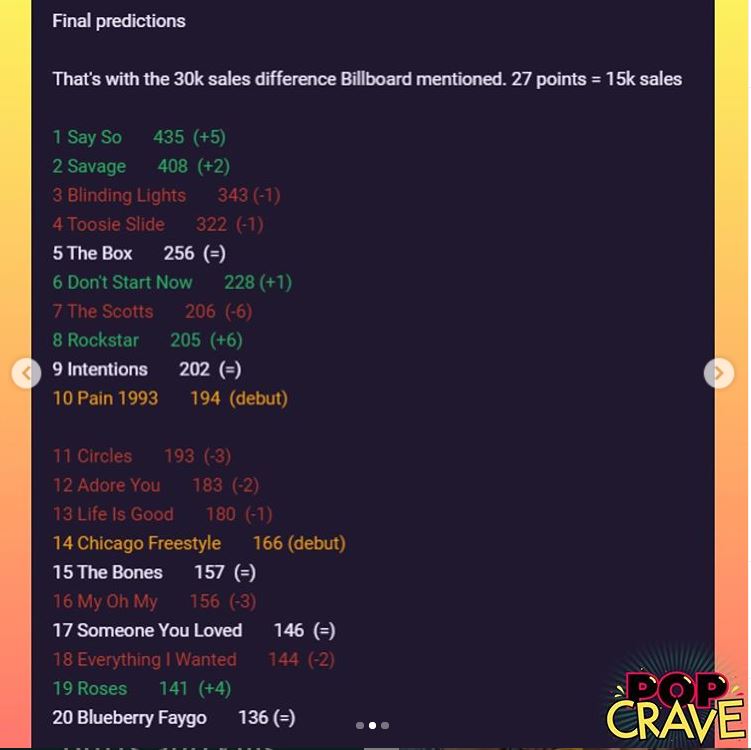 Bên cạnh đó, Rockstar - ca khúc từng “hăm he” soán ngôi No.1 của 2 nam rapper Roddy Ricch và DaBaby, sau một tuần “biệt tích” khỏi Top10 nay đã bất ngờ trỗi dậy trở lại trên vị trí thứ 9. Liệu rằng ca khúc sẽ có thể duy trì được sự bền bỉ này và tiếp tục thăng hạng trong những tuần tiếp theo?