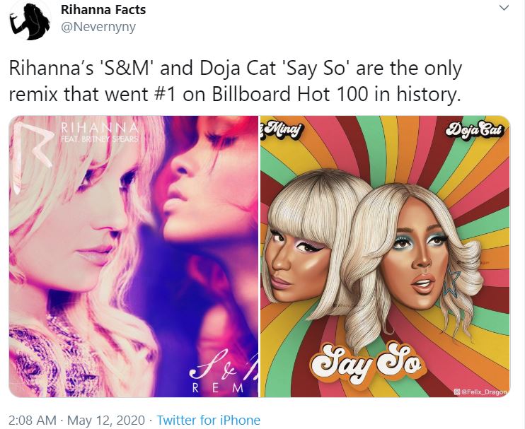 Được biết, bên cạnh bản remix S&M của Rihanna và Britney Spears (2011) thì Say So chính là ca khúc remix thứ 2 trong lịch sử có thể đạt được No.1.