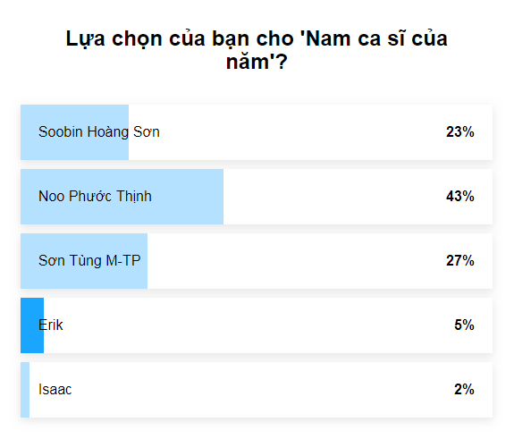 Và xin chúc mừng, người thắng giải trong hạng mục “khó nhằn” này không ai khác ngoài Noo Phước Thịnh - chàng Hoàng tử hào hoa và đầy tài năng của làng nhạc Việt! Anh chàng đã thắng với con số đầy thuyết phục: 43%, vượt một khoảng cách tương đối xa với người đứng vị trí thứ 2.