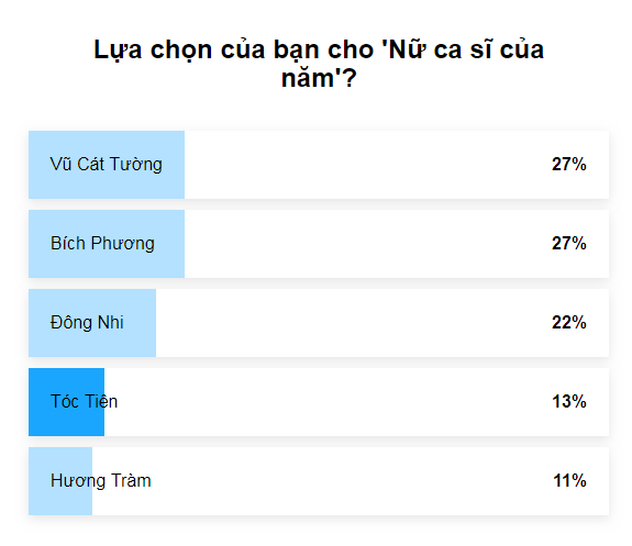 Xin chúc mừng hai quán quân của chúng ta: Vũ Cát Tường và Bích Phương! Cả hai đều đã xuất sắc dẫn đầu BXH với đồng số phiếu bình chọn là 27%, đây có thể xem là một trong những trường hợp hiếm hoi có đến hai cái tên cùng đứng đầu!