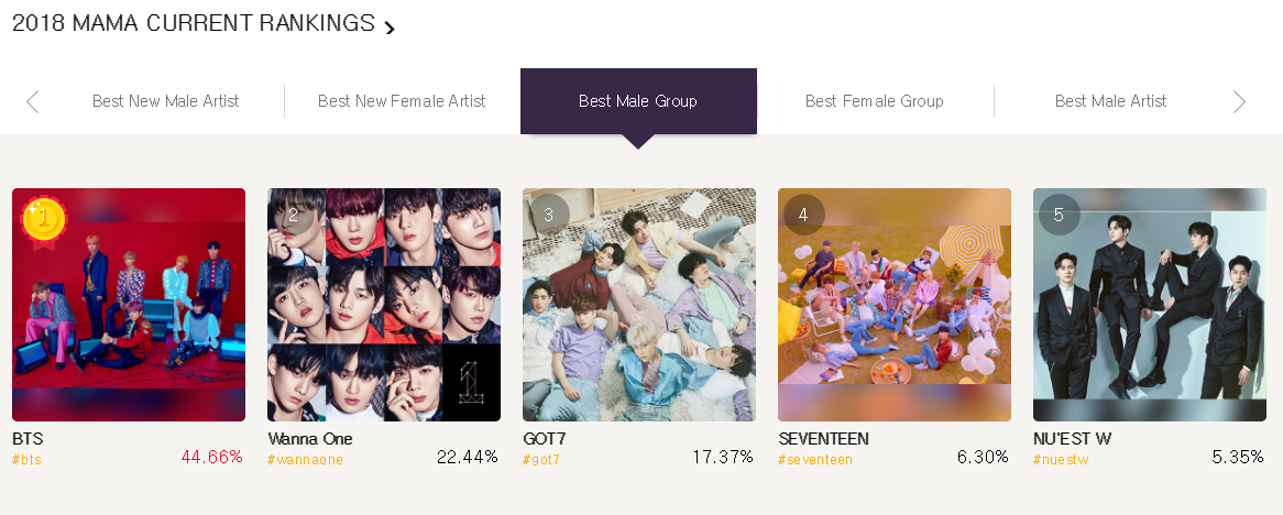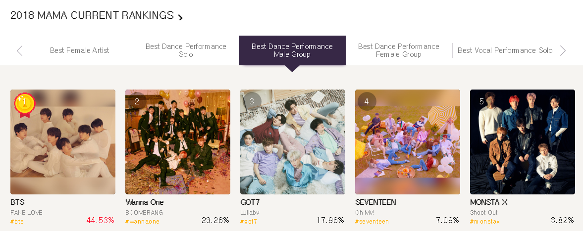 Điều đặc biệt là ở 2 hạng mục giải Daesang Ca khúc của năm và Nghệ sĩ của năm, BTS đều xuất sắc dành vị trí dẫn đầu, vượt xa các đối thủ khác như Wanna One, GOT7, Seventeen, TWICE,… Trong khi đó, nhóm nhạc nam SM - EXO gần như không xuất hiện tại hệ thống bình chọn của MAMA năm nay.