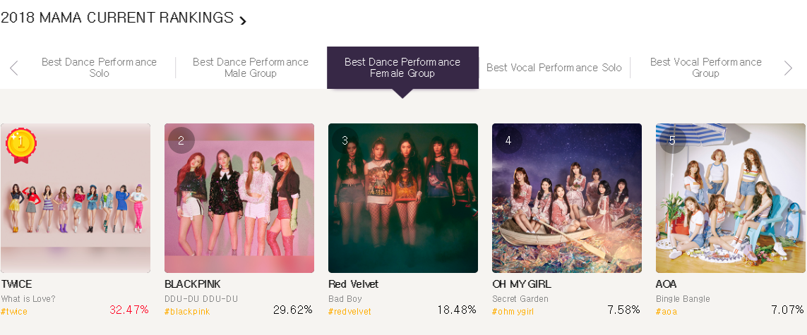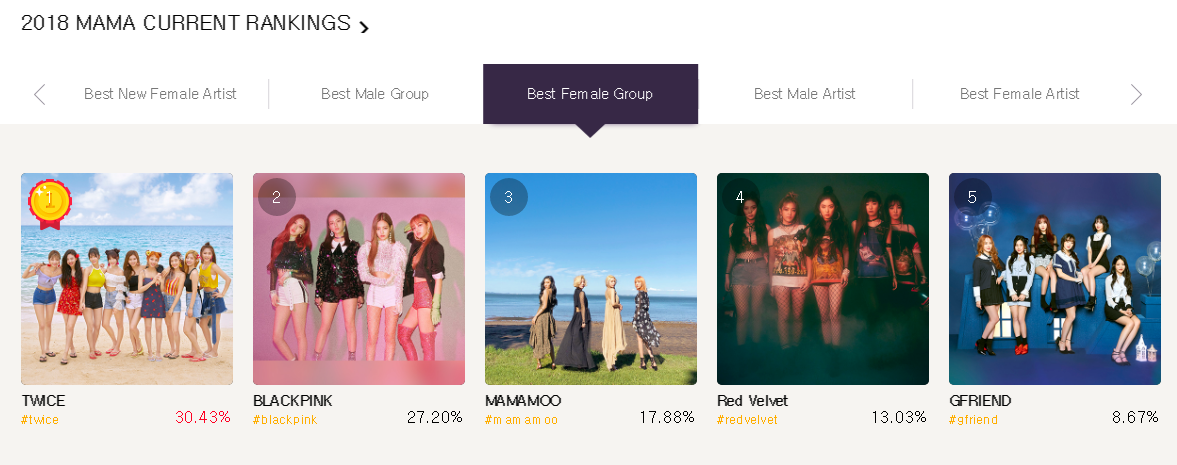 Trong khi BTS một mình một ngựa không đối thủ, về phía các nhóm nhạc nữ, TWICE và BlackPink lại đang trong tình thế bám đuổi nhau sát nút. Tại hạng mục Nhóm nhạc nữ xuất sắc nhất và Màn trình diễn của nhóm nữ xuất sắc, TWICE đều đang dẫn đầu. Tuy nhiên, kết quả cuối cùng ra sao vẫn còn là một ẩn số có thể thay đổi bất cứ lúc nào.