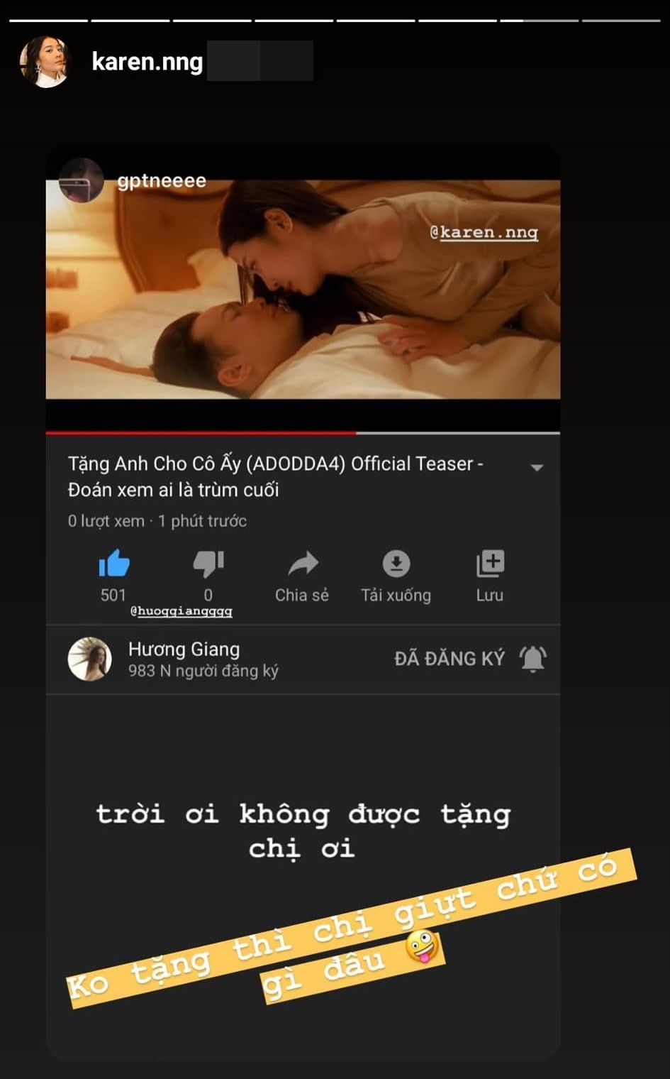 Cụ thể, một khán giả đã nhắc nhở Hương Giang rằng “không được tặng anh ấy cho Hân“, tuy nhiên Hân “tiểu tam” (Karen Nguyễn) nào phải dạng vừa, cô nàng liền lập tức lên tiếng đáp trả. “Gia Hân” đã chụp lại đoạn chia sẻ của khán giả này và post lên story Instagram cùng dòng caption đầy sự “thách thức”: “Không tặng thì chị giật chứ có gì đâu“.
