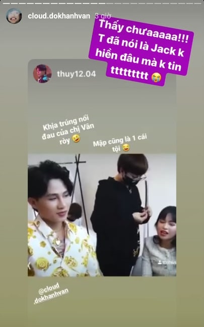 Sau khi hậu trường MV Là 1 thằng con trai được đăng tải, người hâm mộ tiếp tục phát hiện ra một “rổ” những khoảnh khắc thú vị của Jack và Khánh Vân. Mới đây, trên trang cá nhân của mình, Khánh Vân tiếp tục có màn “bóc phốt” Jack vì thói… xéo sắc.