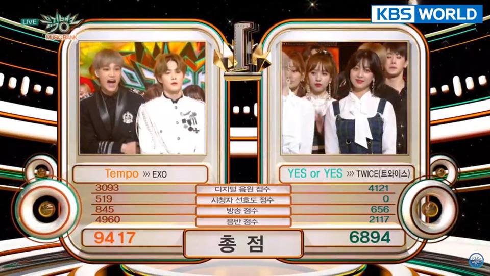 Chiều 16/11, show âm nhạc hàng tuần Music Bank đã diễn ra với hàng loạt màn biểu diễn hấp dẫn. Đặc biệt, hai ứng cử viên tranh cúp tuần này là TWICE với Yes Or Yes và EXO với Tempo, đây đều là hai nhóm nhạc đình đám của K-Pop nên người hâm mộ rất hồi hộp chờ đợi màn trao cúp tuần này.