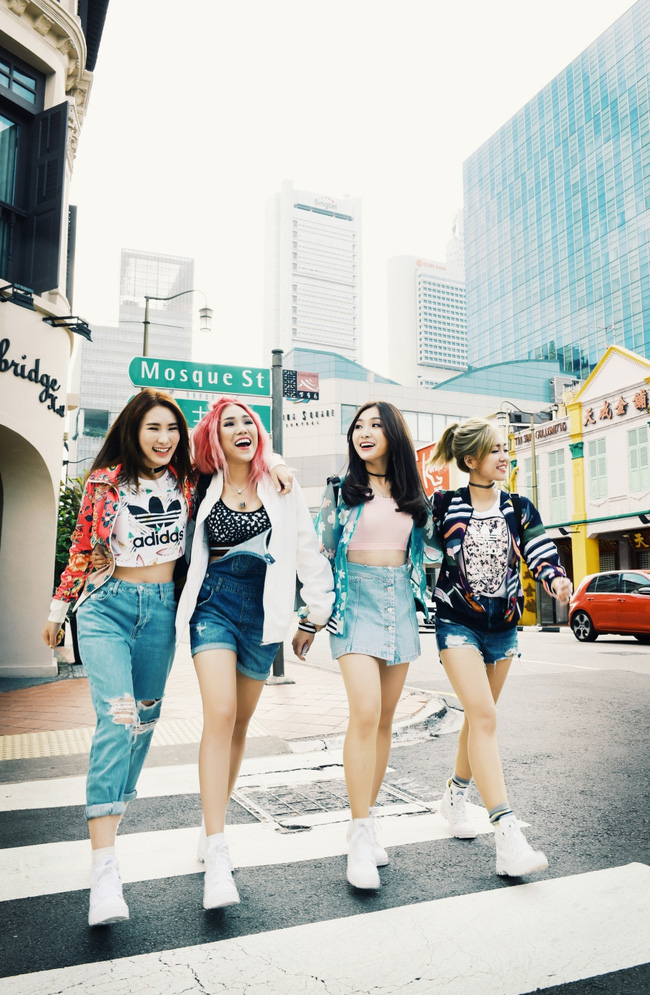 Các cô gái rạng rỡ trên 1 góc phố của đảo quốc Sư tử.