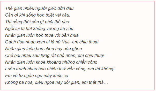 Nhưng khi ca khúc này được phát hành, rất nhiều người đã nhận ra ca từ có điều thú vị. Các câu hát “Cô ta ca lên hay như Mỹ Tâm. Cô ta xinh tươi model nhất năm, em thì không!“ hay “Thế gian nhiều người gieo đớn đau. Cần gì khi sống hơn thiệt vài câu. Nhân gian luôn khoe khoang những chiến công. Luôn tranh nhau bao nhiêu thứ viển vông, em thì không!”khiến khán giả “khoái ra mặt” vì nghĩ rằng cô nàng đang thầm mỉa mai Vũ Xuân Hùng với ca khúc cũ mà nếu Mỹ Tâm không hát thì cũng chẳng ai chú ý đến.