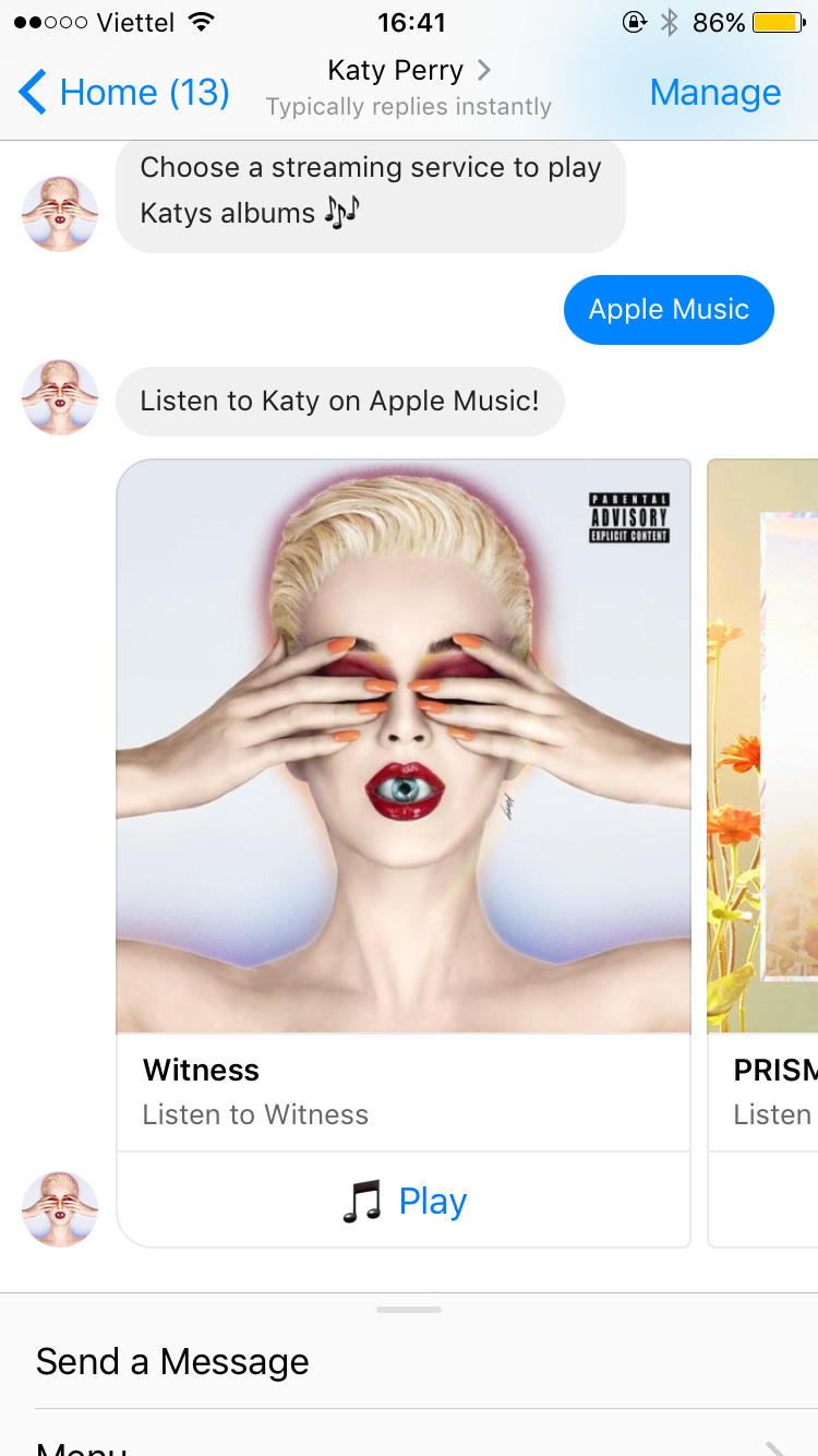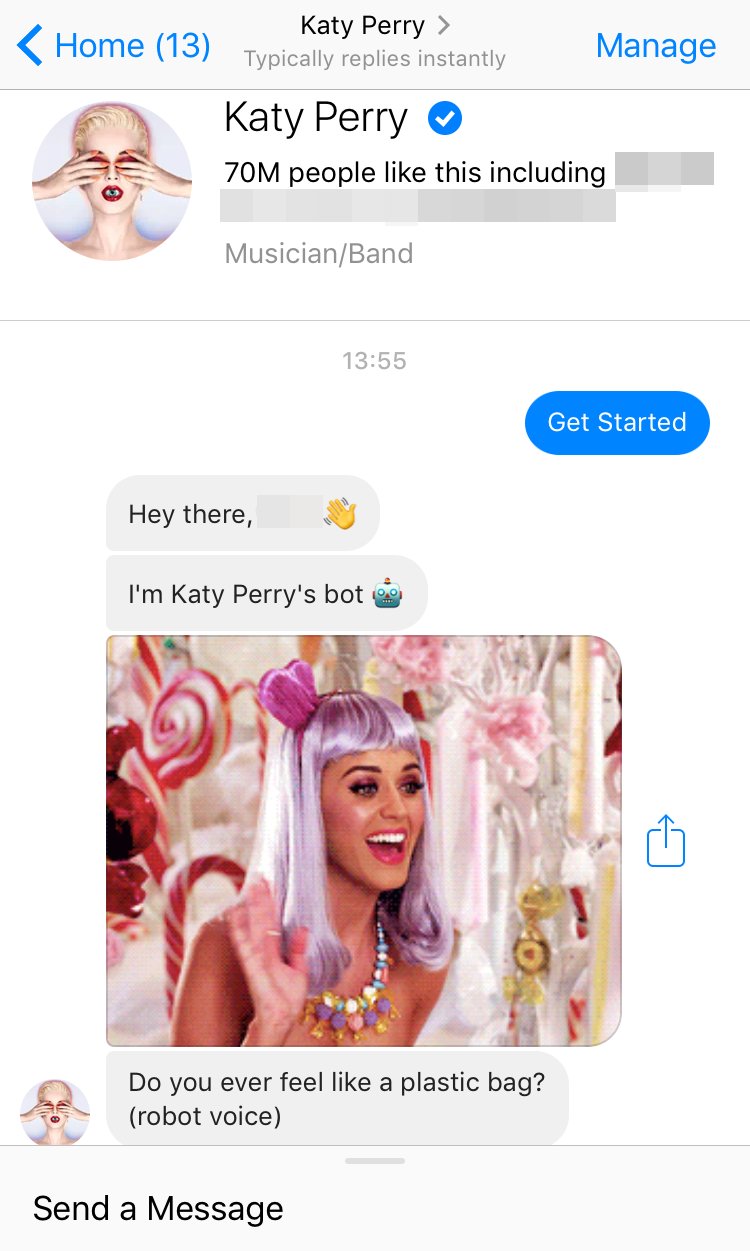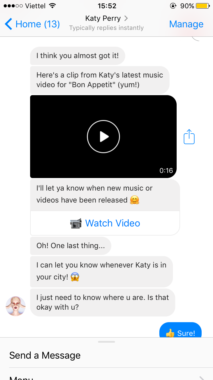 Sự thật, đây là một tính năng mới được đội ngũ kỹ thuật team Katy cài đặt theo dạng tin nhắn trả lời tự động (chatbot). Khi bạn nhấn vào tin nhắn với fanpage Katy, ngay lập tức phía đầu dây bên kia sẽ chào hỏi và giới thiệu đó là chatbot của Katy Perry kèm một hình động cô nàng ca sĩ gửi lời chào cực đáng yêu. Chatbot sẽ trò chuyện và tương tác với bạn, hay thậm chí còn gửi đến bạn các MV, album nhạc của Katy. Có thể thấy, đây là một chiêu thức quảng bá sản phẩm cực kì sáng tạo, độc lạ có một không hai và dễ chiếm cảm tình của bất cứ ai thử trải nghiệm nó.