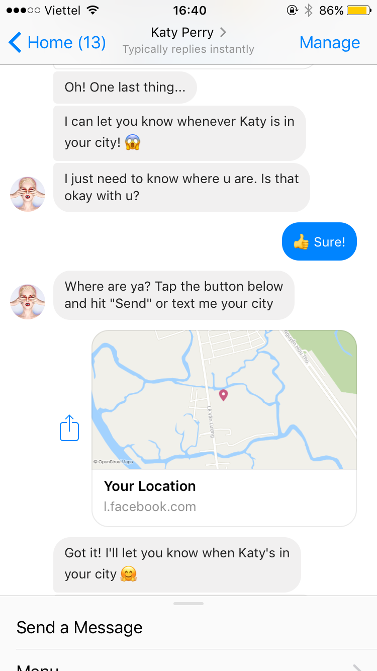 Thậm chí, chatbot sẽ còn bảo bạn gửi vị trí bạn đang ở để nó tự động thông báo đến bạn nếu như Katy đang ở nơi đó.