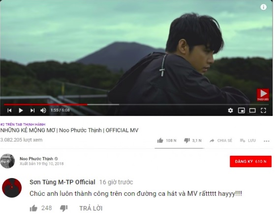 Cách đây ít giờ, cộng đồng mạng được một phen “dậy sóng” khi xuất hiện thông tin Sơn Tùng M-TP trực tiếp bình luận dưới MV Những kẻ mộng mơ của Noo Phước Thịnh trên YouTube với lời chúc: “Chúc anh luôn thành công trên con đường ca hát và MV rất hay!”. Dù chưa được xác nhận chính thức nhưng với sự “check” của các fan với tài khoản được cho là của Sơn Tùng M-TP thì tất cả đều có niềm tin rằng đây chính xác là tình cảm của anh chàng dành cho đàn anh.