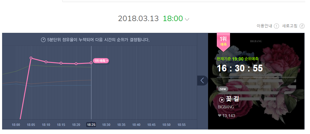 Biểu đồ lượng nghe sau 25 phút đầu tiên, BigBang liên tục dẫn đầu.