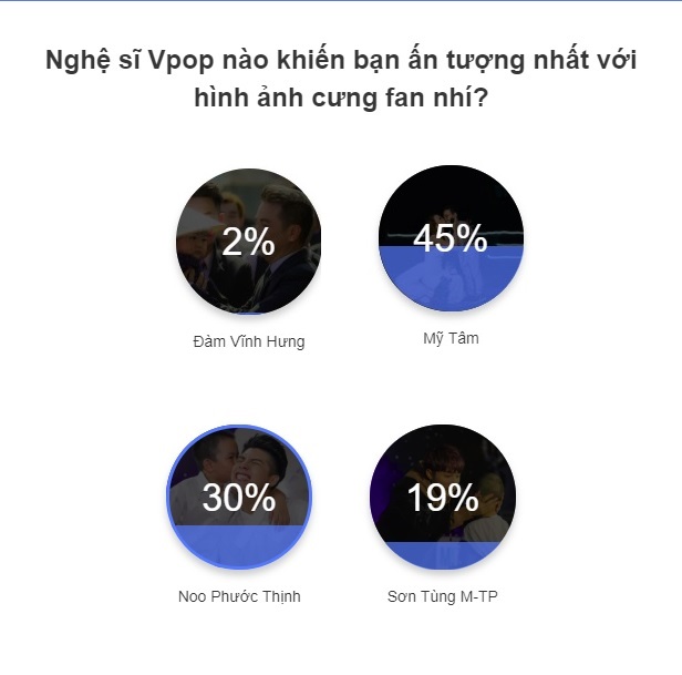 Và ngay sau khi bài viết Ra mà xem hậu phương fan nhí hùng hậu khiến các nghệ sĩ Việt trở nên 'mềm yếu' thế này đây! lên sóng, đông đảo độc giả của SAOstar đã quan tâm và bình chọn xem ai là nghệ sĩ gây thương nhớ nhất với hình ảnh cưng fan nhí. Không ngạc nhiên khi “chị đẹp” Mỹ Tâm lại chiến thắng với tỉ lệ áp đảo 45%.