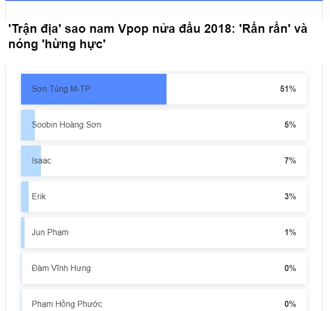 Và ngay sau khi bài viết 'Trận địa' sao nam Vpop nửa đầu 2018: 'Rần rần' và nóng 'hừng hực' lên sóng, đông đảo độc giả SAOstar đã tham gia vào cuộc bình chọn xem ai là nam nghệ sĩ có màn “ra trận” gây ấn tượng nhất. Không nằm ngoài dự đoán, sản phẩm “siêu bão” Chạy ngay đi từ anh chàng Sơn Tùng M-TP đã chiếm trọn hơn một nửa tỉ lệ bình chọn với con số 51%.