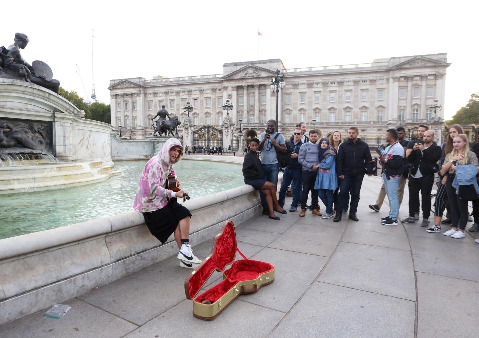 Cụ thể, trong chuyến du hí London mới đây của cặp uyên ương Justin Bieber - Hailey Baldwin, khi đến trước Cung điện Hoàng gia Buckingham, có vẻ máu nghệ sĩ trong lòng anh chàng Love Yourself bỗng nổi lên cuồn cuộn. Thế là, không cần ánh đèn sân khấu, chẳng đợi micro hiện đại, chỉ có mình anh chàng và cây guitar cũ kĩ. Justin đã ngẫu hứng hát bản hit Cold Water trước đài phun nước của cung điện, không quên để chiếc vỏ đàn mở ra - không khác gì một gã lang thang hát rong thực thụ mà ta dễ dàng thấy trên đường phố!