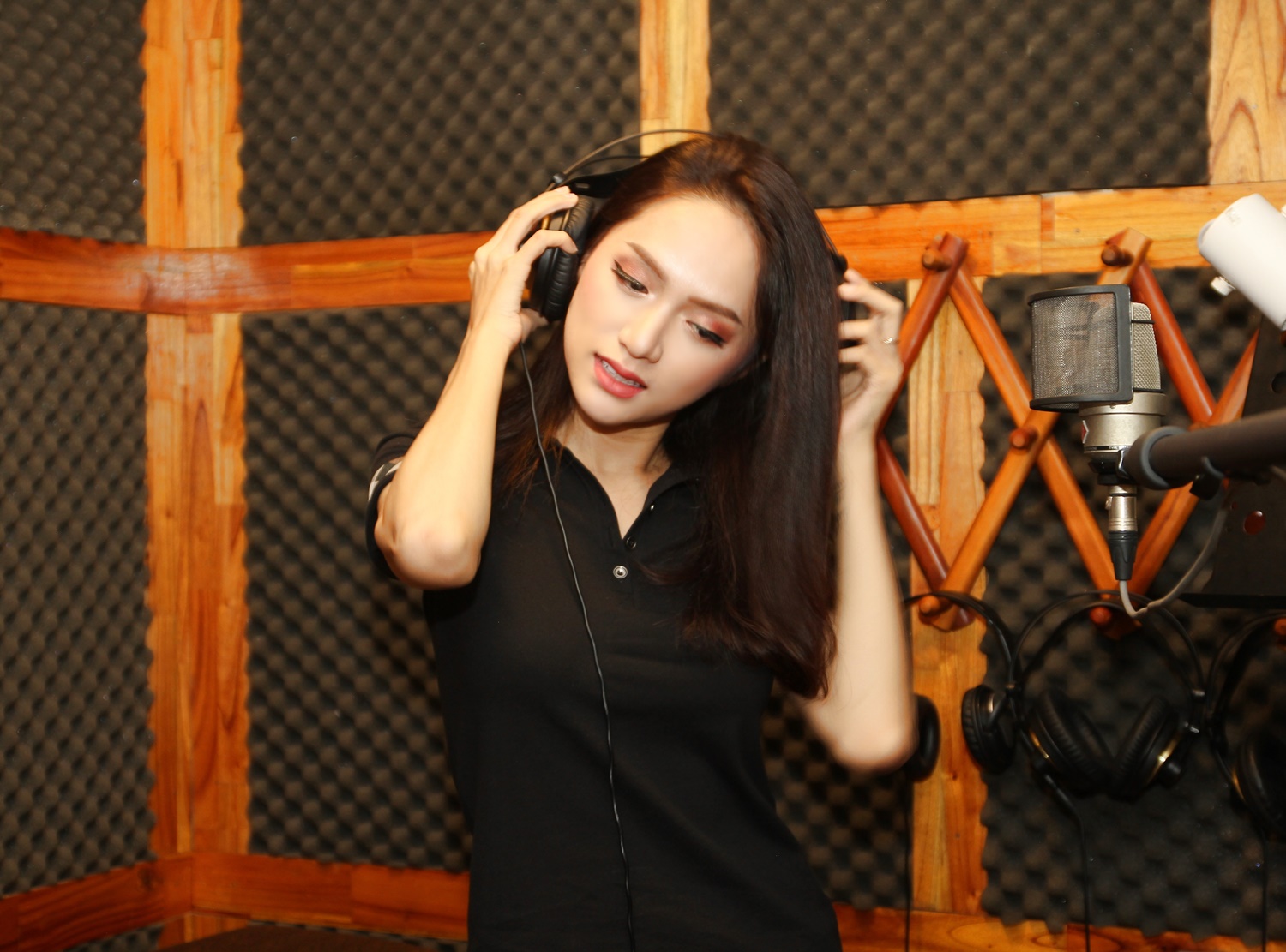 Hình ảnh giản dị của Hương Giang trong phòng thu.