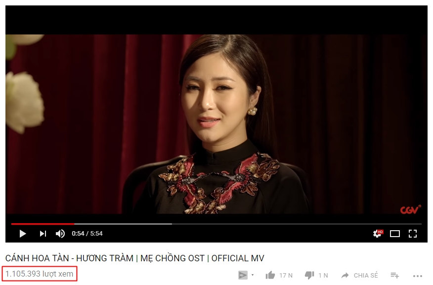 Mới đây, Hương Tràm đã cho lên sóng MV bản ballad Cánh hoa tàn - OST chính thức của bộ phim chiếu rạp đang thu hút nhiều sự quan tâm từ dư luận: Mẹ chồng. Và sau 3 ngày lên sóng, MV Cánh hoa tàn hiện đã cán mốc hơn 1 triệu view. Đây là một thành tích đáng tự hào bởi Hương Tràm cũng như ekip không hề PR rầm rộ cho sản phẩm này.