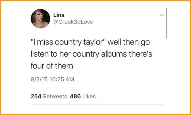 Hôm nay, các fan như muốn khóc ròng khi nhìn thấy cô nàng bấm like một tweet trên Twitter với nội dung: “”Tôi nhớ Taylor đồng quê quá”, nói vậy thì hãy đi mà nghe hết những album của cô ấy, có tận 4 album country cơ mà”, đây là dòng trạng thái của fan như thể một màn “dằn mặt” tất cả những ai đang mong chờ Taylor trở lại với nhạc đồng quê. Tuy chưa một lần lên tiếng về vấn đề có quay lại hình tượng trước đây hay không nhưng qua động thái bấm like này, có thể thấy cô nàng đã gián tiếp nói câu trả lời là “Không!”. Xin được chia buồn với các fan của Taylor đồng quê, nhưng dù sao đi nữa, cô nàng vẫn đang rất thành công với con đường hiện tại và đó mới là điều quan trọng nhất thay vì phải câu nệ những thứ xưa cũ.