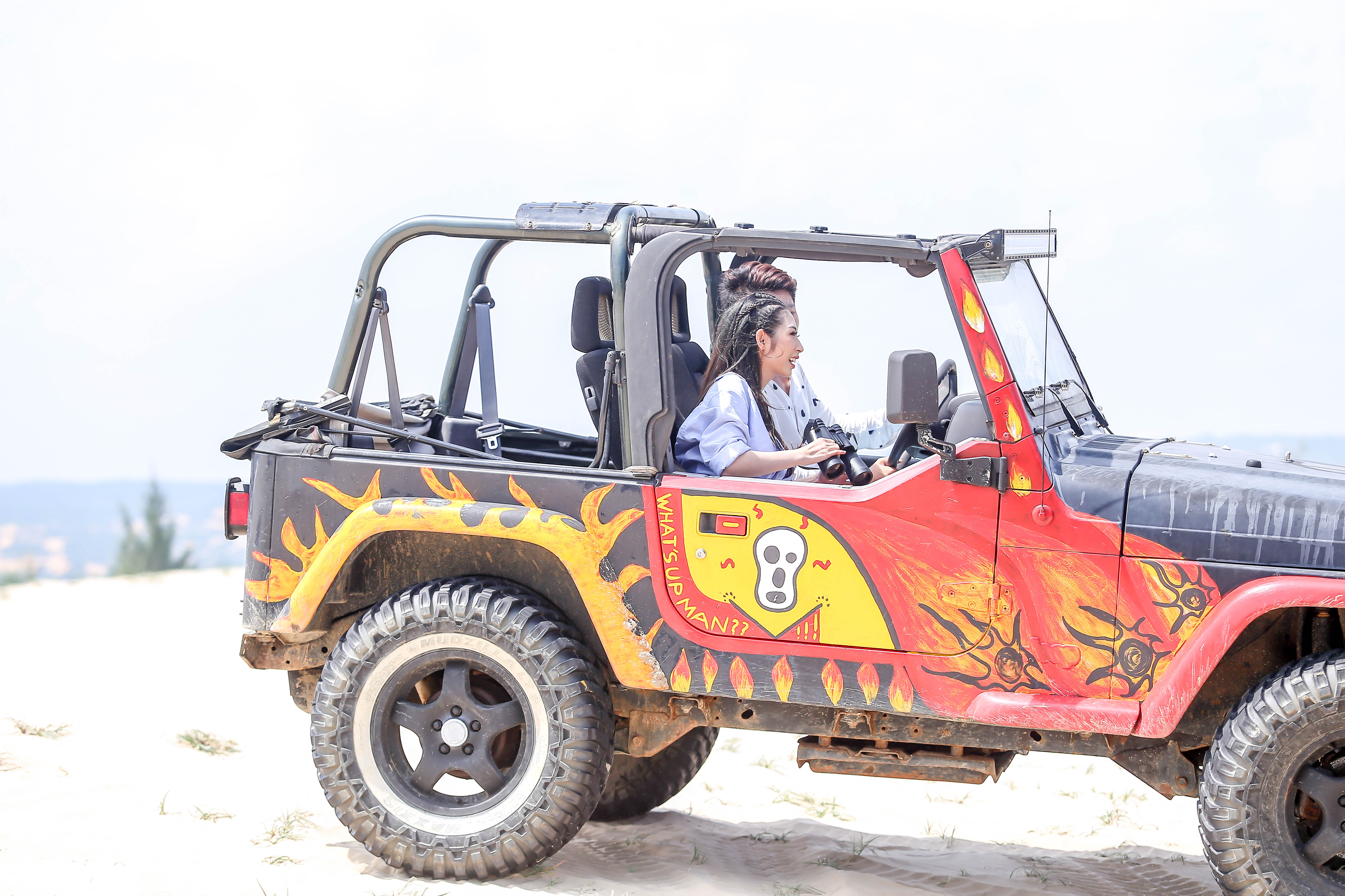 Vì chỉ mới tập lái trước đó ít phút nên cả đoàn được một phen thót tim khi anh chàng lúng túng khi điều khiển xe jeep.