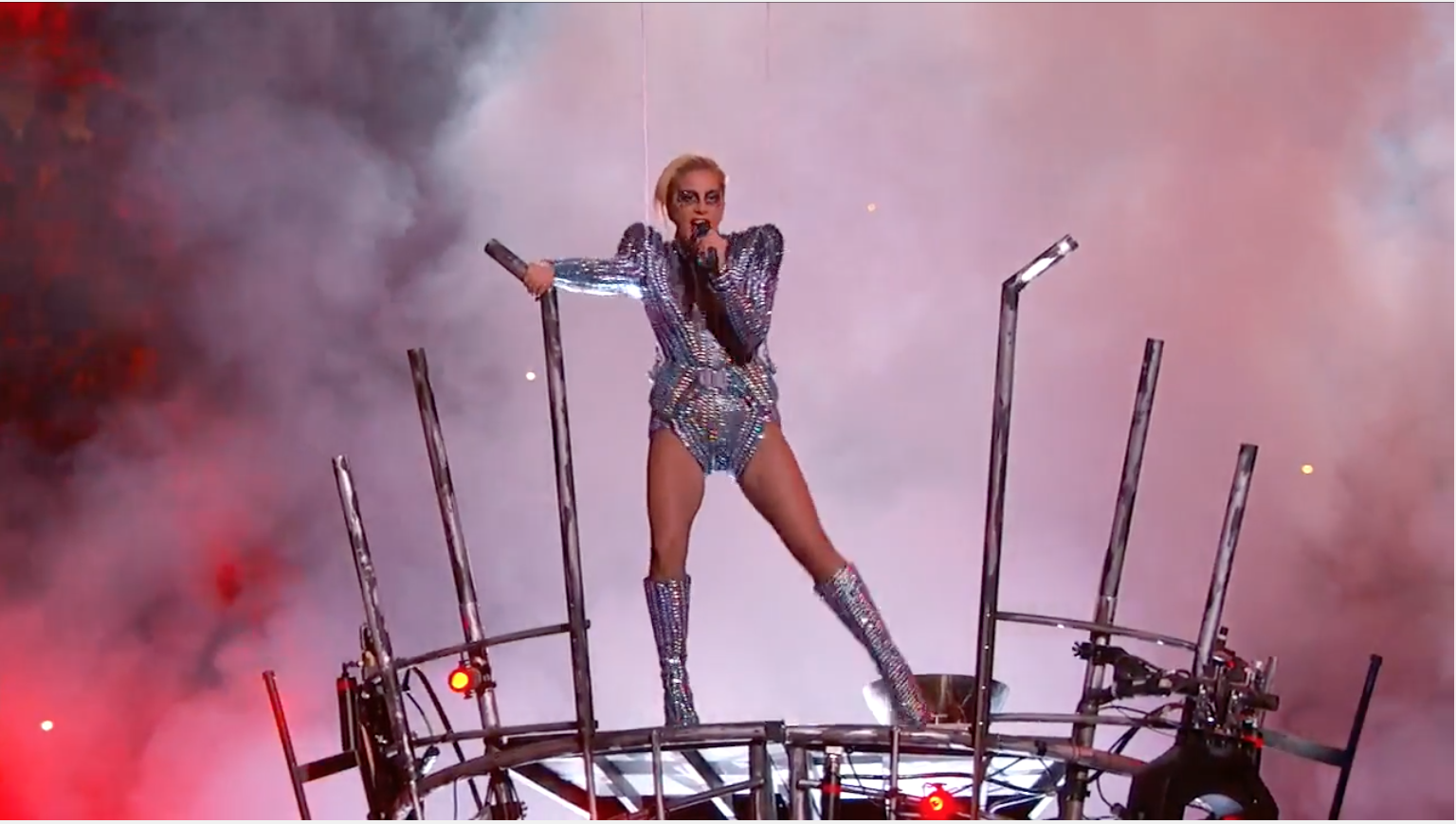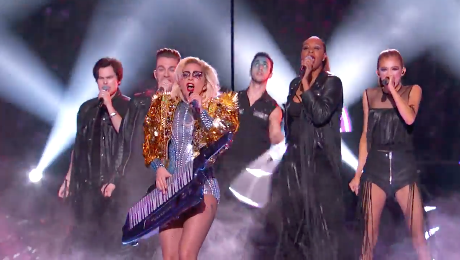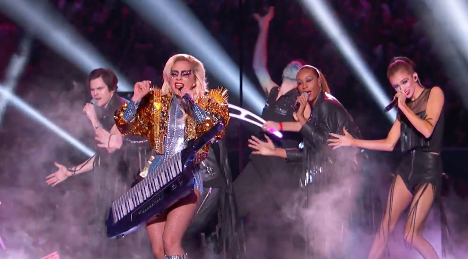 Chính xác như thông tin đã đưa ra, một loạt các siêu hit trải dài suốt sự nghiệp đã được cô nàng mang đến chiêu đãi khán giả của Super Bowl. Mở màn bằng God Bless America ngay trên nóc sân vận động, Lady Gaga đã thật sự khiến tất cả mọi người phải ngước nhìn.