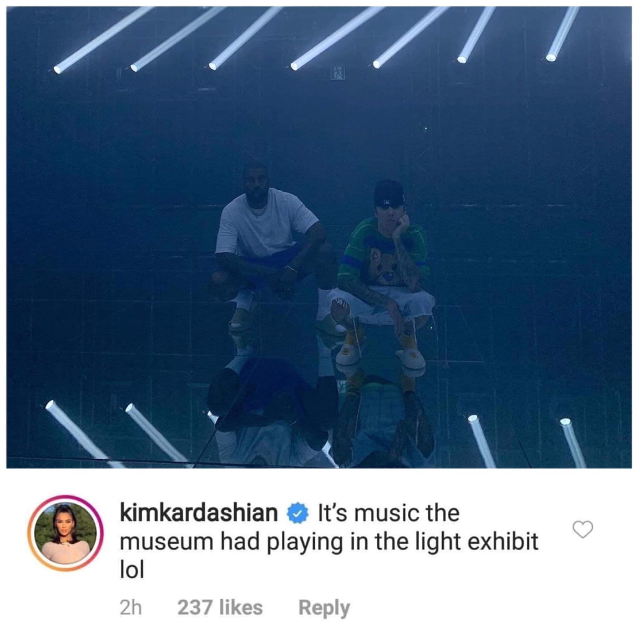 Cụ thể, cô nàng đã để lại một bình luận dưới bức ảnh được cho là bằng chứng cho màn hợp tác của Kayne West và Justin Bieber: “Đó chỉ là một phần lời bài hát mà người ta phát ở đêm hội ánh sáng thôi mà hahaha”. Dường như Kim Kardashian đã cảm thấy không hài lòng vì những tin đồn liên quan tới chồng mình nên cô đã đích thân lên tiếng phủ nhận. Như vậy, sẽ không có bất kỳ màn hợp tác nào giữa Kayne West và Justin Bieber (ít nhất là ở thời điểm hiện tại).