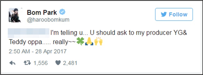 Park Bom được chính YG Entertainment xác nhận đã không còn là thành viên của công ty từ tháng 11/2016. Chính vì thế, động thái mới nhất từ cô nàng khiến các fan không khỏi tò mò.