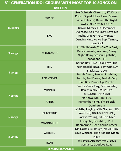 Còn với nhóm Twice, xuất thân từ show sống còn Sixteen, các cô nàng chính thức ra mắt với tư cách thành viên nhà JYP vào năm 2015. Những bản hit của Twice cho thấy sự trưởng thành của nhóm qua từng concept âm nhạc và được đón nhận nhiệt tình của khán giả. Các ca khúc giúp Twice vươn lên dẫn đầu Kpop group gen 3 có nhiều ca khúc lọt top 10 BXH Melon nhất là: Like Ooh-Aah, Cheer Up, TT, Knock Knock, Signal, Likey, Heart Shaker, What Is Love?, Dance The Night Away, Yes or Yes và Fancy. Nhóm nhạc nối tiếp theo sau EXO và Twice là Mamamoo với tổng cộng 9 bài hát.