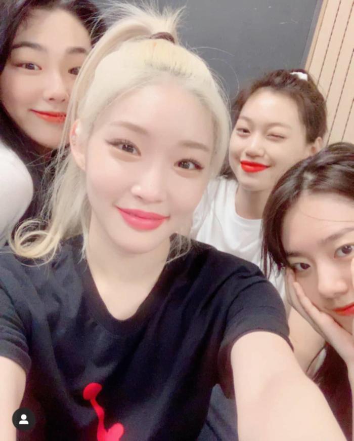 Chungha đăng ảnh trong phòng thu cùng Mina, Sohye và Doyeon.