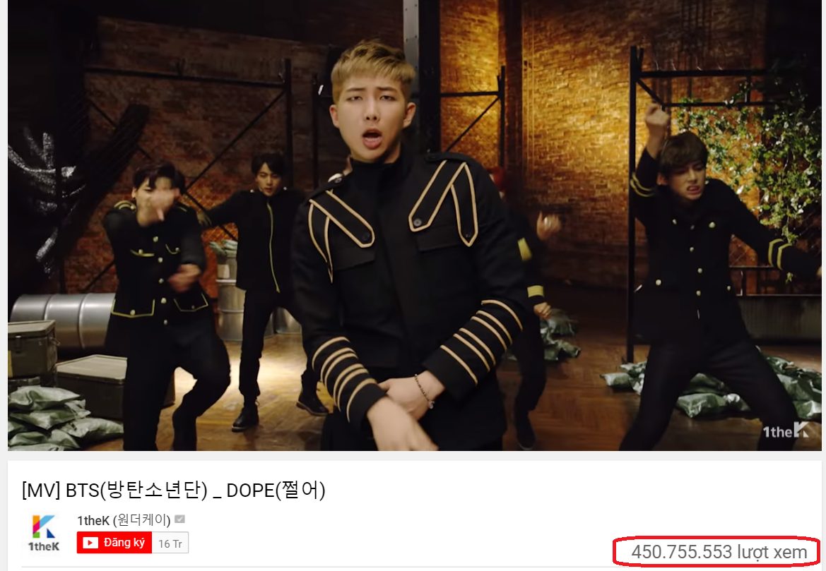 Một tuần dày đặc các thông tin từ MV mới của BlackPink nhưng các fan BTS cũng không hề nhàn rỗi. Mới đây, với nỗ lực “cày view” cho thần tượng, MV DOPE của BTS đã chính thức cán mốc 450 triệu lượt xem trên youtube.
