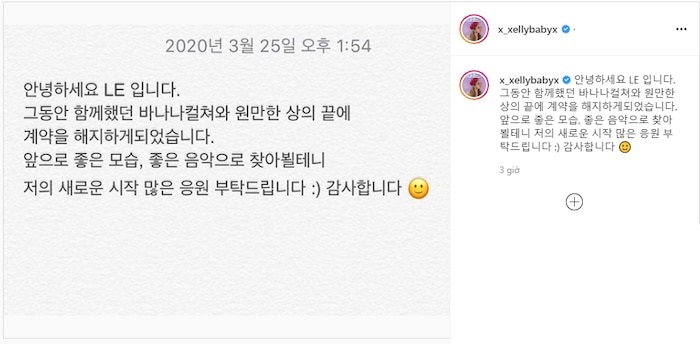 Vào ngày 25/3, thành viên LE của EXID đã thông báo đến người hâm mộ về việc chấm dứt hợp đồng cùng Banana Culture. Cô chia sẻ: “Xin chào. Đây là LE. Sau một vài cuộc thảo luận, tôi đã đi đến một quyết định với Banana Culture để chấm dứt hợp đồng. Tôi sẽ sớm trở lại với một hình ảnh tốt nhất và âm nhạc hay nhất, vì vậy xin tiếp tục gửi lời động viên đến sự khởi đầu mới của tôi. Cảm ơn các bạn”.