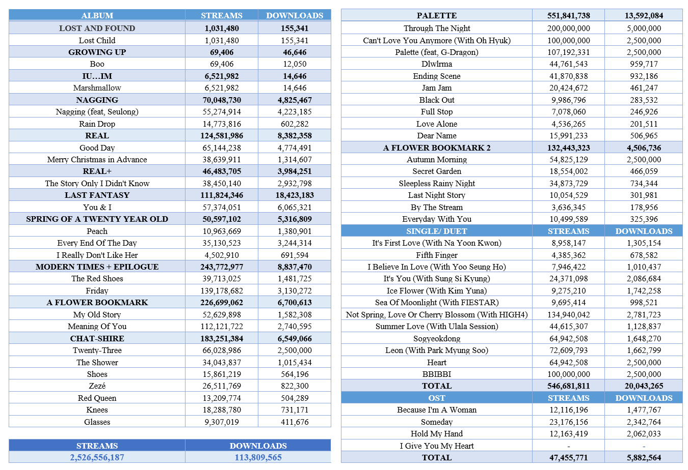 Ở mảng doanh thu, cô nàng IU trở thành ca sĩ solo duy nhất trong lịch sử bán hơn 100 triệu bản tại Hàn Quốc. Trong đó mảng digital (kĩ thuật số) chiếm phần lớn trong tổng số doanh thu của IU, lên đến 113.809.565 bản. Phần còn lại được tạo thành từ doanh số mảng physical (album vật lý) với con số là 984.774 bản. IU chính thức debut vào năm 2008, những sản phẩm IU phát hành trong 12 năm qua đều được khán giả đón nhận nồng nhiệt, chính vì thế con số hơn 100 triệu bản tại Hàn Quốc là xứng đáng với nữ ca sĩ.