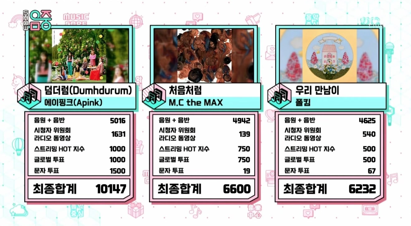 Bên cạnh sân khấu đặc biệt của (G)I-DLE, chiến thắng tại Music Core hôm nay cũng đã gọi tên Dumhdurum của Apink với 10.147 điểm, đánh dấu chiến thắng thứ 50 của Apink trên show âm nhạc kể từ khi debut đến nay. Hôm nay cũng là sân khấu quảng bá của Oh My Girl, NCT Dream, Second Aunt Kim Da Vi (Kim Shin Young), GOT7, MAMAMOO’s Solar, APRIL, (G)I-DLE, Kim Ho Joong, GWSN, H&D, CRAVITY, Kanto, cignature, TOO, and LEGIT GOONS.