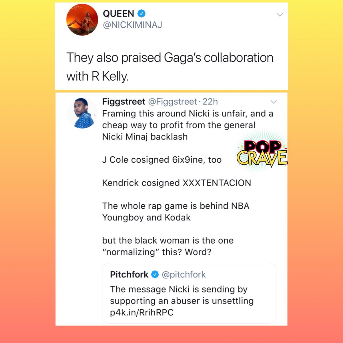 Sự việc này đã khiến Nicki vô cùng tức giận, và đăng một tràn tweet, trong đó, cô có nhắc đến… Lady Gaga để bảo vệ cho những ý kiến của mình. Nicki đã khơi gợi lại khoảng thời gian Gaga hợp tác với R.Kelly trong ca khúc Do What You Want mặc cho thời điểm đó Kelly cũng có những hành vi sai trái trong chuyện tình dục. Điều đáng nói đến là Gaga có quay một đoạn MV đầy khiêu khích cho ca khúc với R. Kelly nhưng cô đã không phát hành.