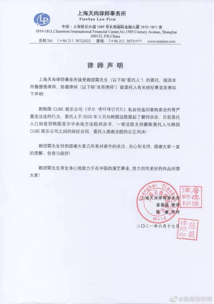 Phía đại diện anh chàng cho biết: “#Lại Quán Lâm Kết Thúc Hợp Đồng Thành Công# Cảm ơn toà án với phán quyết công bằng! Cảm ơn tất cả sự tin tưởng và đồng hành của mọi người. Không quên đi những kì vọng ban đầu và cùng nhau tiến lên!”.