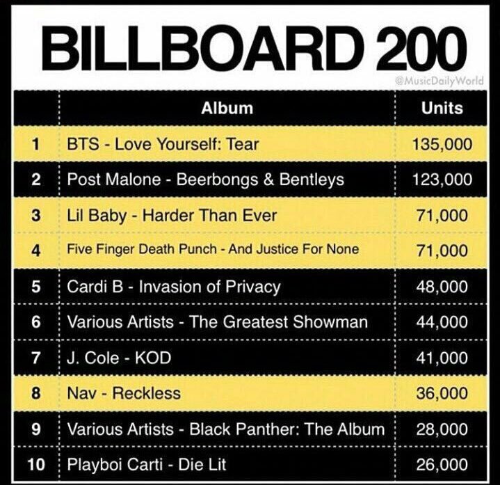 Với thành tích này, BTS đã chặn đứng bước tiến của Post Malone với beerbongs & bentleys, vượt lên trên những album khủng khác như Beautiful Trauma của P!nk, Invasion of Privacy của Cardi B,… Đồng thời với kì tích này, họ đã tự phá kỉ lục của chính mình được thiết lập hồi năm ngoái với album Love Yourself: Her (dừng chân tại vị trí thứ 7). Đặc biệt, Billboard cũng nhấn mạnh rằng Love Yourself: Tear là album nước ngoài đầu tiên chạm đỉnh Billboard 200 trong suốt 12 năm qua, một thành tích mà có lẽ chính các fan cũng không dám mơ tới!