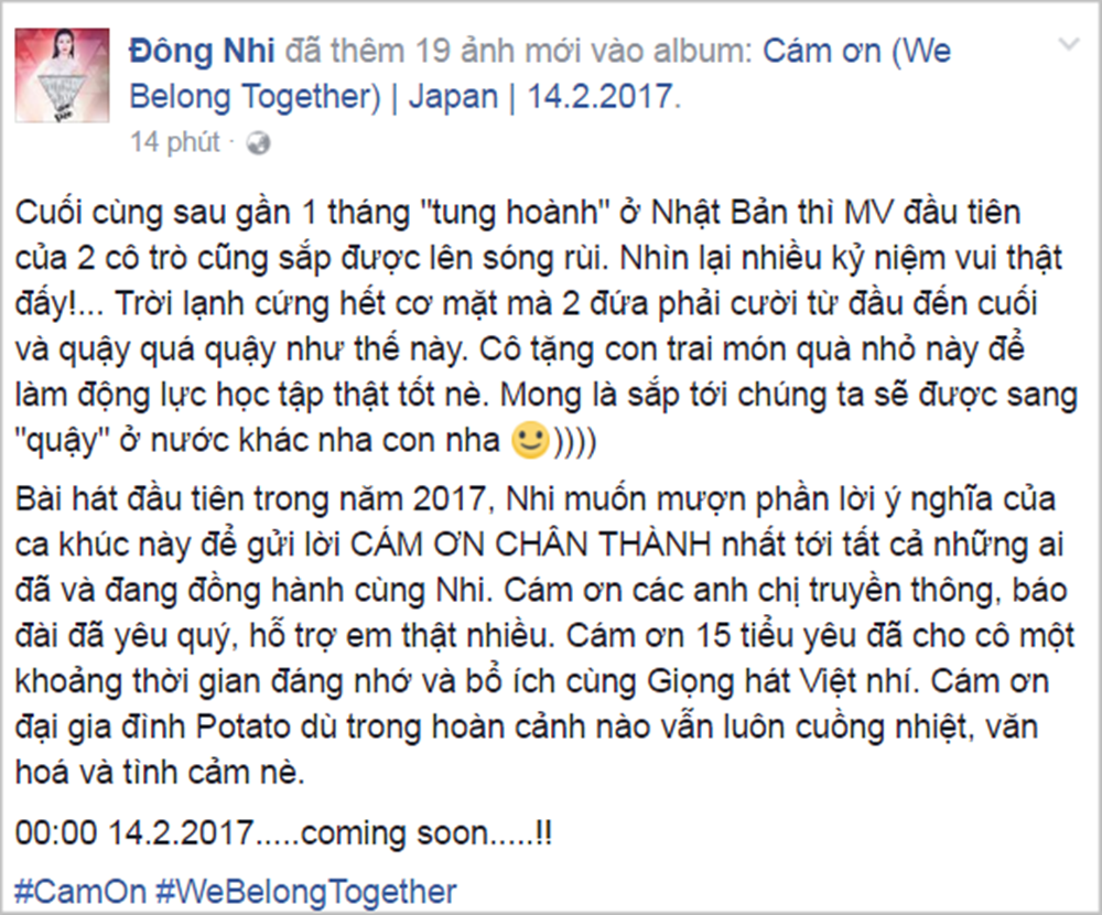 Mới đây, Đông Nhi gây bất ngờ cho khán giả khi thông báo thời gian ra mắt MV thực hiện cùng Quán quân Giọng hát Việt nhí Nhật Minh - Cám ơn (We Belong Together). Cụ thể, MV được quay tại Nhật Bản của 2 cô trò sẽ tung ra vào đúng 00:00 ngày 14/2. Chính thông tin này đang làm cho cộng đồng fan của Đông Nhi cùng cộng đồng fan Sơn Tùng “dậy sóng”, bởi chủ nhân hit Lạc trôi cũng đã ấn định ngày ra mắt MV Valentine của mình - Nơi này có anh vào đúng thời điểm này.
