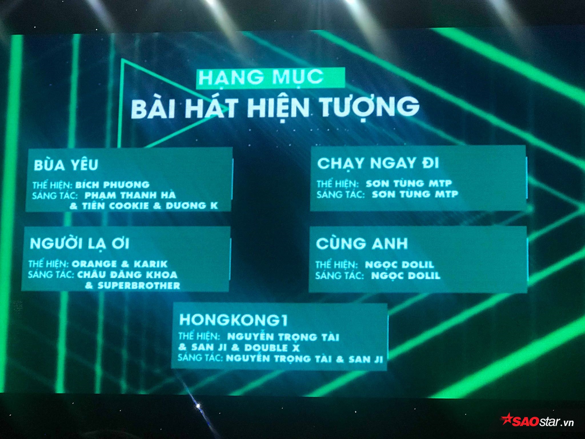 Về hạng mục Ca khúc của năm và Bài hát hiện tượng, hàng loạt bản hit “nổi đình nổi đám” trong suốt một năm qua cũng đã góp tên trong giải thưởng này. Nổi bật có thể kể đến như Chạy ngay đi (Sơn Tùng M-TP), Bùa yêu (Bích Phương), Người lạ ơi (Karik - Orange), Chạm đáy nỗi đau (Erik), HongKong1 (Nguyễn Trọng Tài và San Ji),… Đặc biệt có thể nhận thấy, ở nhiều hạng mục, Sơn Tùng M-TP và Bích Phương là hai cái tên góp mặt trong nhiều đề cử bình chọn.