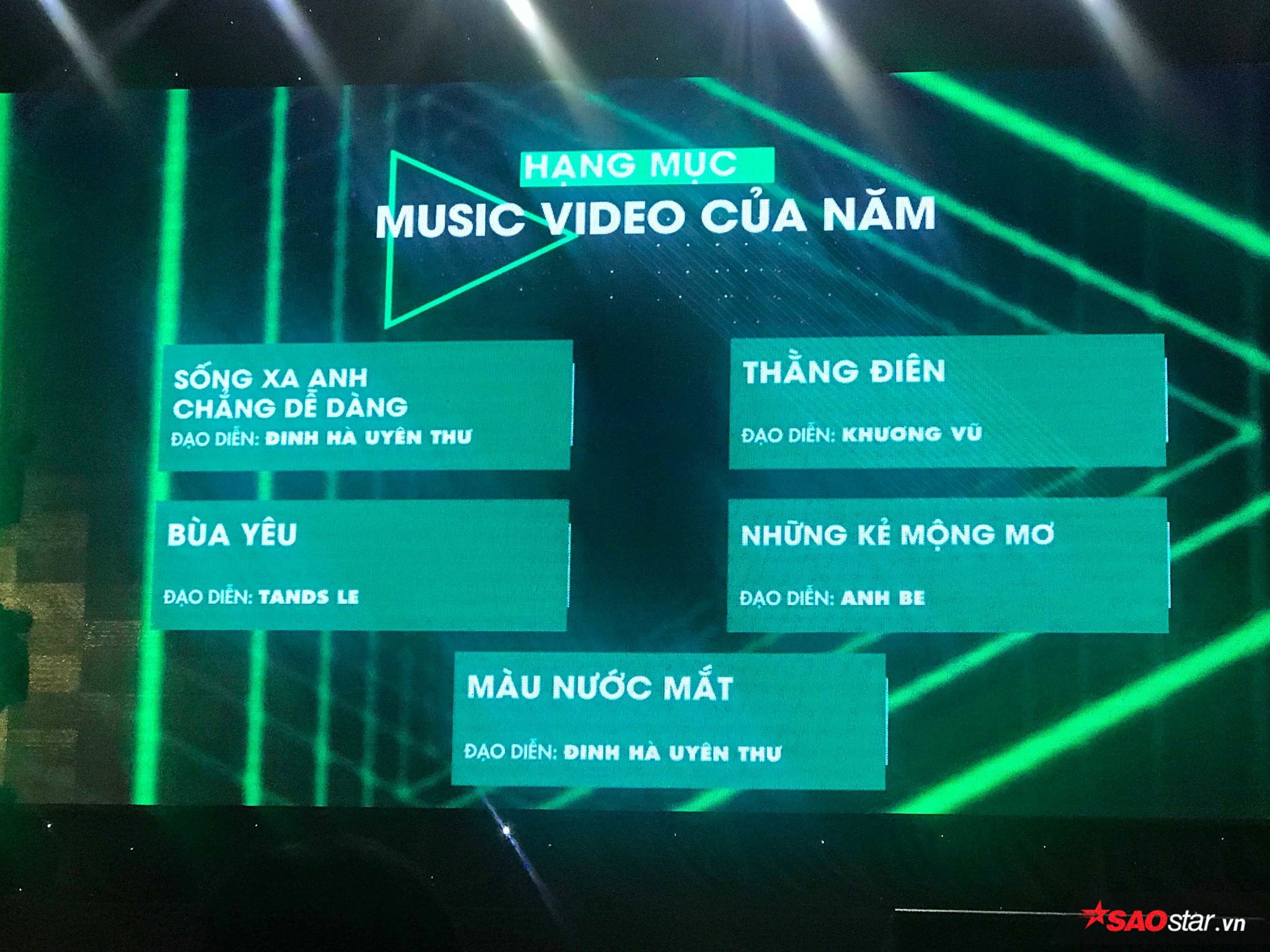 Bên cạnh đó, hạng mục Music Video của năm nhằm tôn vinh các đạo diễn góp phần tạo nên những MV “khủng” của các ca sĩ cũng ghi nhận các sản phẩm như MV Những kẻ mộng mơ (Noo Phước Thịnh), MV Thằng điên (JustaTee - Phương Ly), MV Sống xa anh chẳng dễ dàng (Bảo Anh), MV Bùa yêu (Bích Phương) hay gần đây nhất là MV Màu nước mắt (Nguyễn Trần Trung Quân)