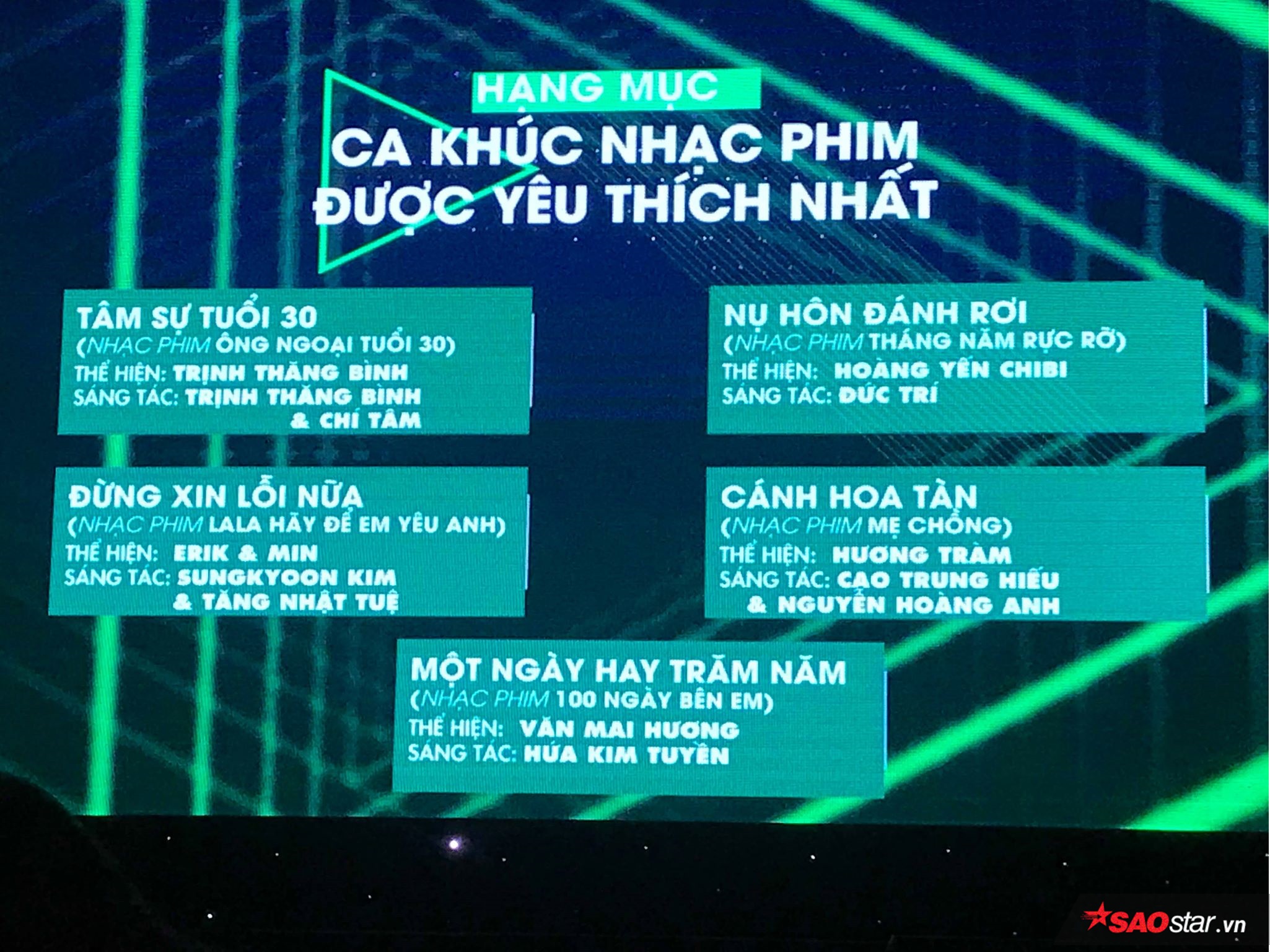 Một trong những hạng mục được khán giả quan tâm đó chính là Ca khúc nhạc phim được yêu thích nhất. Đây cũng là giải thưởng khá mới với Làn sóng xanh 2018 năm nay. 5 ca khúc xuất sắc lọt top đề cử bình chọn đó chính là Tâm sự tuổi 30 (Trịnh Thăng Bình), Nụ hôn đánh rơi (Hoàng Yến Chibi), Đừng xin lỗi nữa (Erik - Min), Cánh hoa tàn, Một ngày hay trăm năm (Văn Mai Hương)