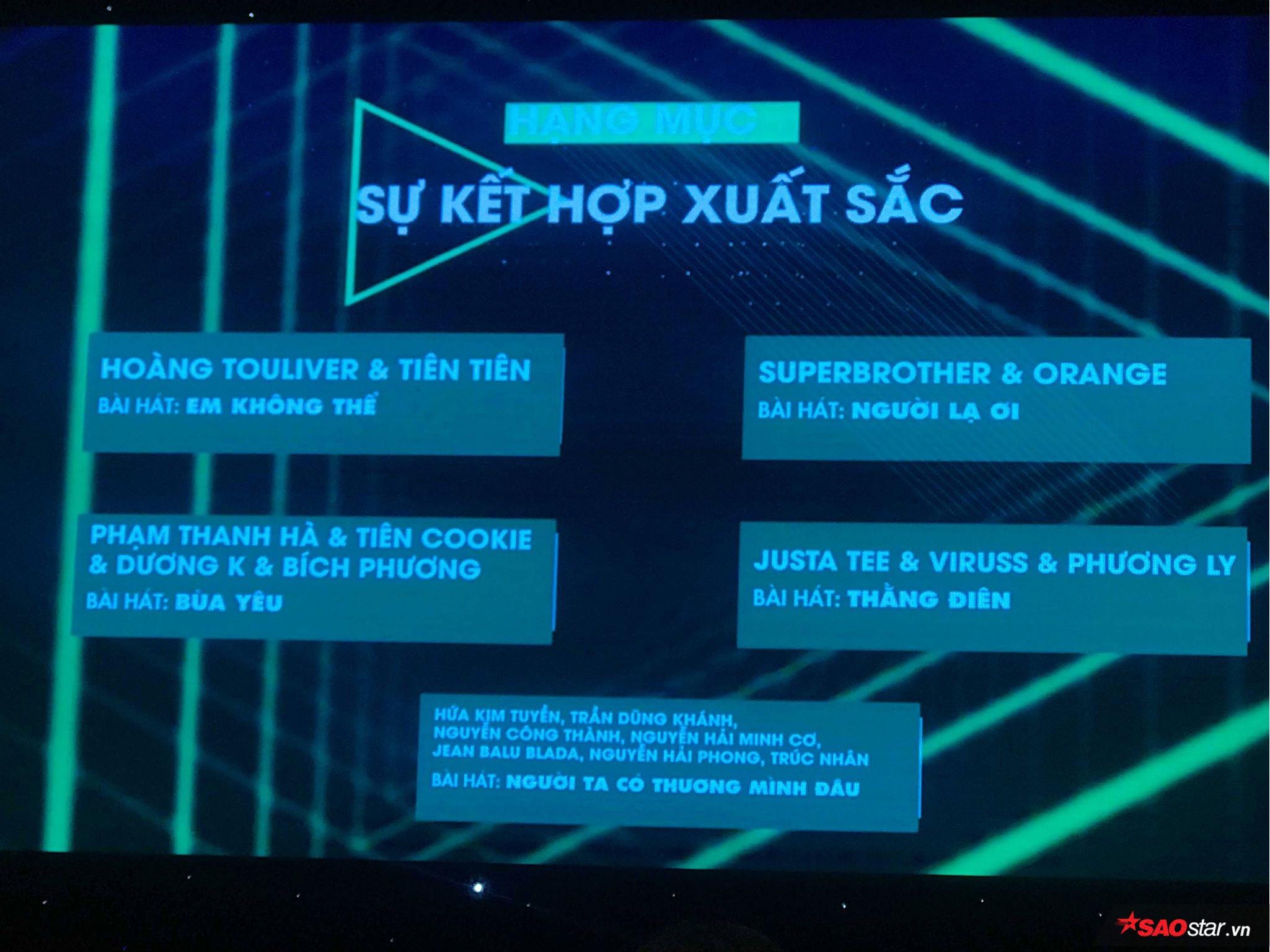 Hạng mục Gương mặt mới xuất sắc và Sự kết hợp xuất sắc cũng là màn ganh đua của loạt những cái tên được khán giả trẻ yêu thích. Trong đó Gương mặt mới xuất sắc xuất hiện những nghệ sĩ trẻ như Nguyễn Trần Trung Quân, Hoàng Yến Chibi, Orange,… hay Sự kết hợp xuất sắc nằm trong các sản phẩm âm nhạc như Bùa yêu, Em không thể, Người lạ ơi, Người ta có thương mình đâu.