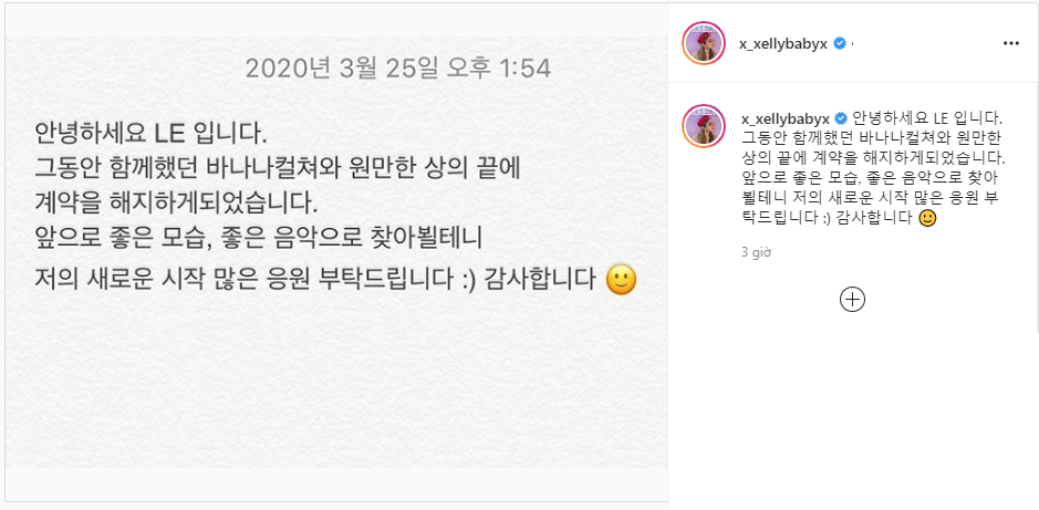 Mới đây, LE đã đích thân thông báo với người hâm mộ về quyết định rời Banana Culture của mình lên instagram chính thức, cô viết: “Xin chào. Đây là LE. Sau một vài cuộc thảo luận, tôi đã đi đến một quyết định với Banana Culture để chấm dứt hợp đồng. Tôi sẽ sớm trở lại với một hình ảnh tốt nhất và âm nhạc hay nhất, vì vậy xin tiếp tục gửi lời động viên đến sự khởi đầu mới của tôi . Cảm ơn các bạn.” Như vậy, tất cả thành viên EXID đều đã rời Banana Culture.