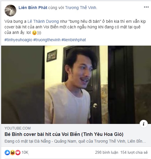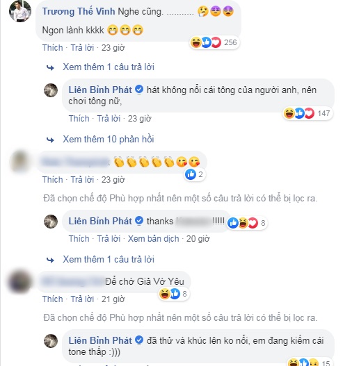Mới đây, các fan của Liên Bỉnh Phát không khỏi thích thú với đoạn clip cover ca khúc Tình yêu hoa gió (Trương Thế Vinh) được anh chàng đăng tải trên trang cá nhân. Ngay lập tức, đoạn clip đã nhanh chóng nhận được sự quan tâm của người hâm mộ. Không chỉ vậy, “chính chủ” Trương Thế Vinh cũng xuất hiện và để lại dòng bình luận khá “đau tim”: “Nghe cũng….. ngon lành”. Nam diễn viên còn thừa nhận mình không thể hát được tông của chàng “voi biển” nên đã phải thể hiện bằng tông nữ.
