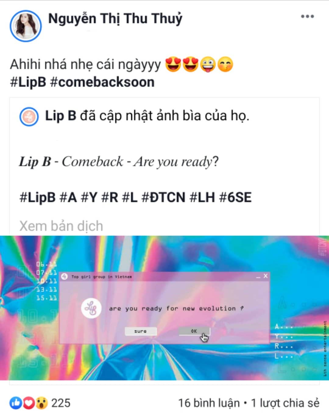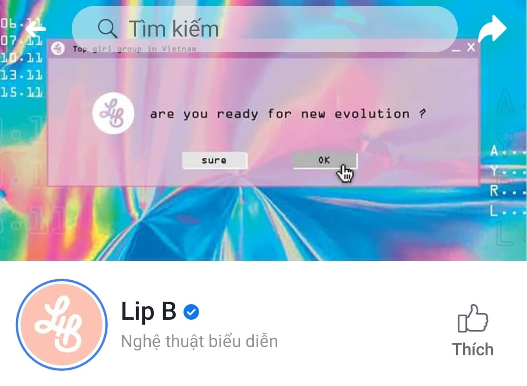 Mới đây, cộng đồng người hâm mộ của Lip B - NAMY đang vô cùng xôn xao trước động thái mới từ nhóm nhạc hậu sự việc Mei dứt áo ra đi. Cụ thể, trên trang fanpage của Lip B, nhóm nhạc này đã bất ngờ thay đổi ảnh bìa với một thông điệp đầy ẩn ý: “Are you ready for new evolution?” (Tạm dịch: Bạn đã sẵn sàng cho sự phát triển mới chưa?).
