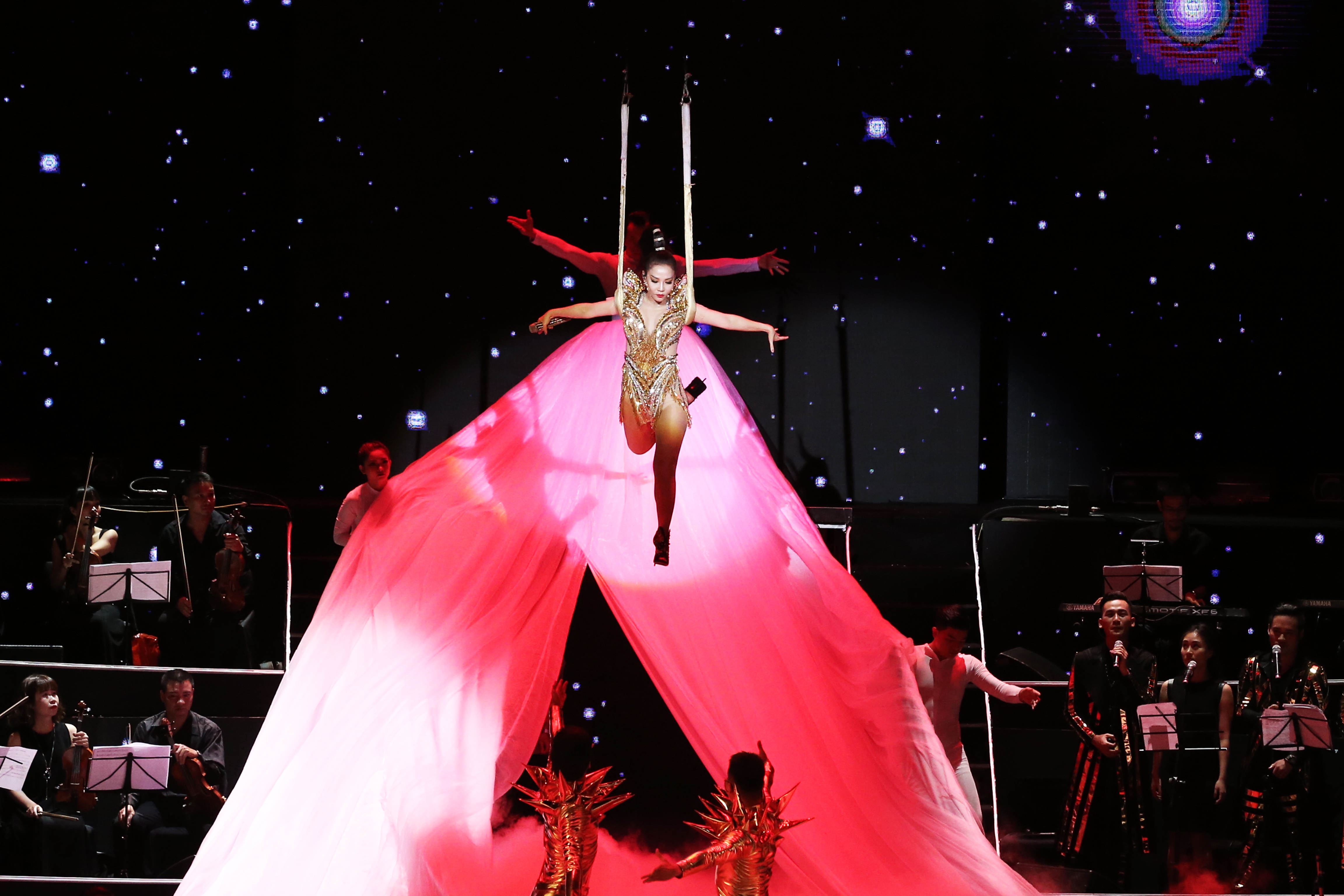 Cô bay xuống sân khấu khiến hàng ngàn khán giả đi từ bất ngờ này tới bất ngờ khác.