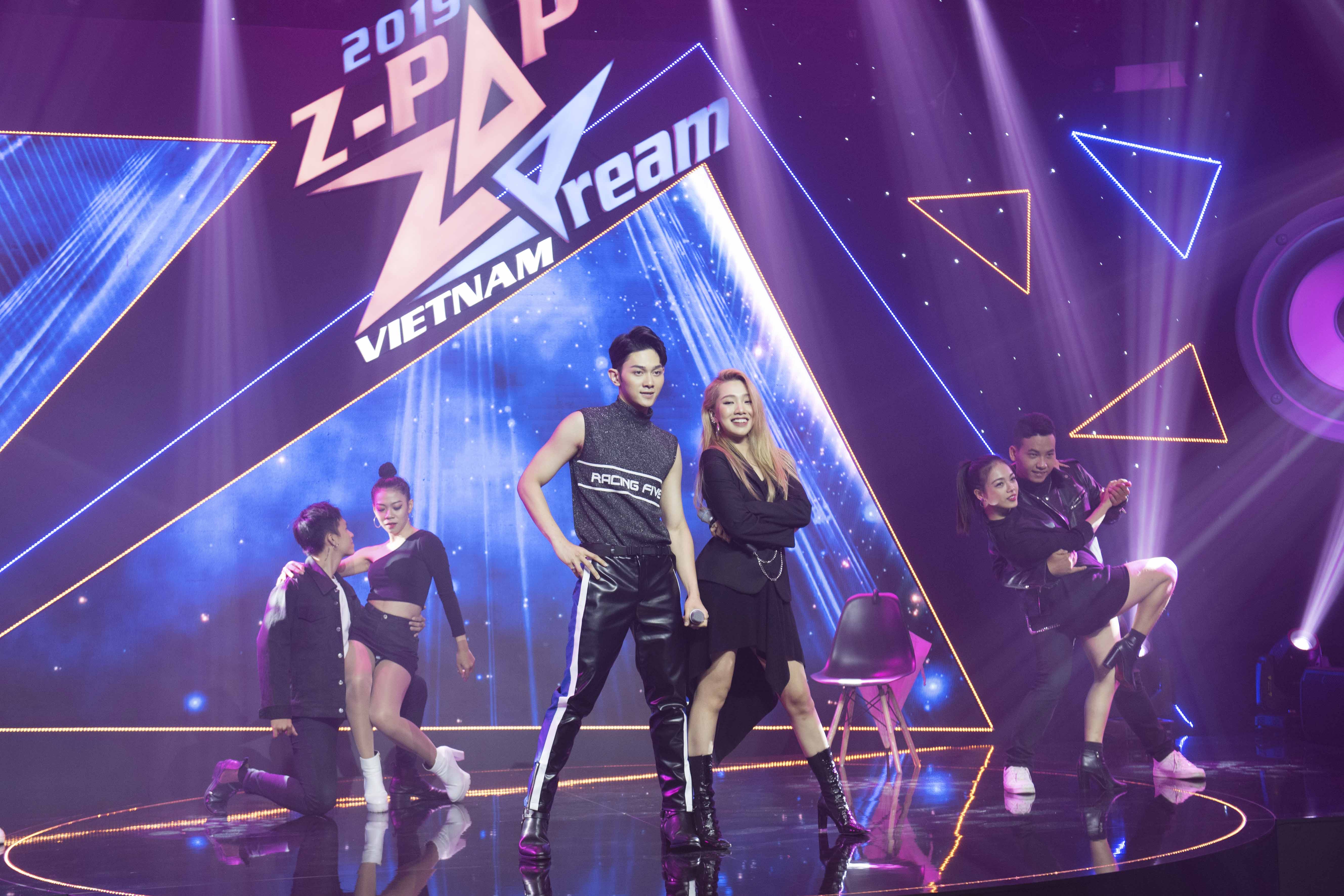 Roy Nguyễn (Z-Boys) và Quin Z (Z-Girls) thể hiện ca khúc tiếng Việt Chị ơi mình yêu thôi.